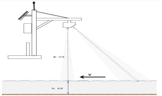 安装示意图如图,现场安装可借助于桥梁,支架等现有的建筑基础,但必须保证流速仪雷达波发射方向与水流方向平行,流速仪发射波与水面呈45,出厂默认调节45°角